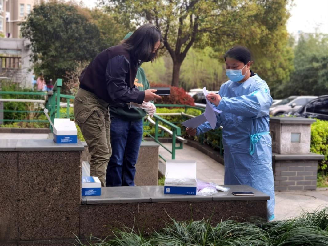 自3月26日開始,吳昊就奔波在社區疫情防控工作的第一線,他的主要工作是協助指導社區居民開展新冠病毒自檢工作。“您好,這里有幾位住戶?請拿好抗原檢測試劑盒。”“檢測前,記得洗凈雙手。檢測時,棉簽伸入1.5到2厘米……”小區的樓道里,同樣的叮囑吳昊重復了無數遍。他和樓組長逐門逐戶發放試劑盒,確保“應檢盡檢、不落一戶、不漏一人”。針對不會自測的高齡人群,吳昊則堅持入戶助檢,貼心幫助老人們完成操作流程。